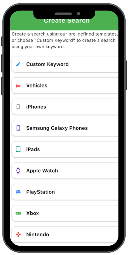 Create searches faster and smarter with our powerful search templates. In addition to using your own custom keywords, you can simply choose a template tailored to your needs—like iPhones, Samsung phones, or vehicles—and we’ll prefill the key details for you. You'll be able to quickly generate high-performing searches with just a few taps.